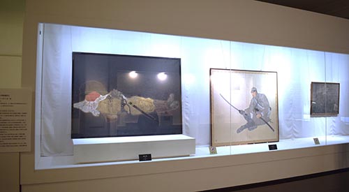 楯』の他、計8点が3期にわたり紹介されている。 第1期は『国之楯』、『護国(御旗)』、『護国(御旗)の裏書』。第2期は『国之楯』、『日本刀』、『浄魂(突撃)』。第3期は『国之楯』、『出陣の朝』、『業火(シンガポール陥落)』、『護国の英霊』が展示される予定である。