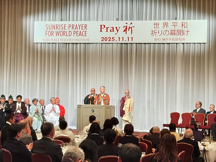 11月11日、NPO神戸平和研究所(杣浩二理事長)が主催する「世界平和 祈りの幕開け」の第9回が神戸ポートピアホテルで開催され、世界の伝統宗教や新宗教の代表や各国大使など約300人が参加した。